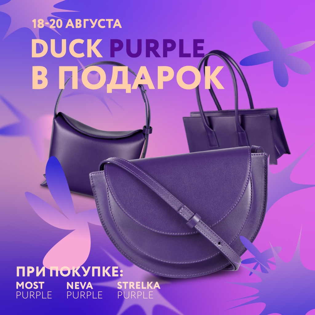 В период проведения акции при покупке сумок Neva purple, Most purple или Strelka purple предоставляется скидка в размере 100% на кошелёк Duck Purple.