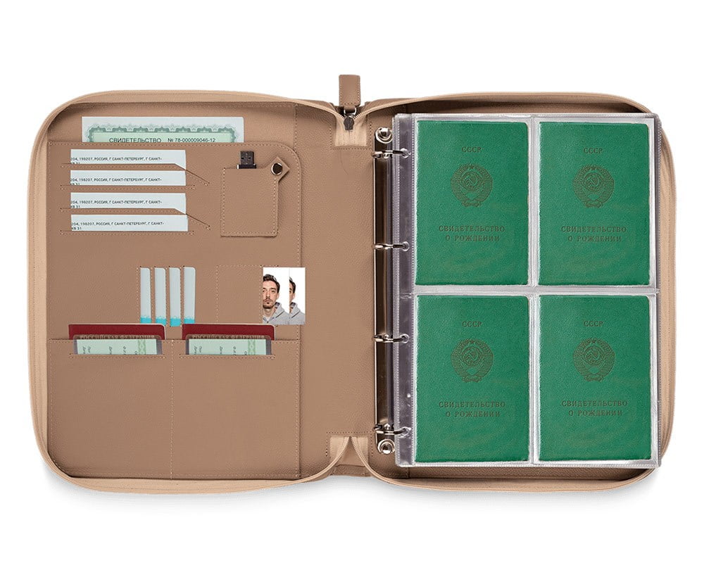 - На первом кожаном развороте предусмотрено место для важных вещей и того, что нам нужно чаще всего: паспортов, СНИЛС, пластиковых карт, флешки и фотографий на документы.