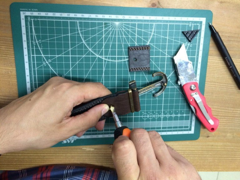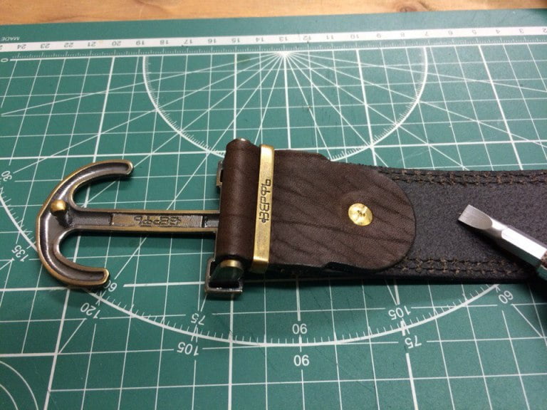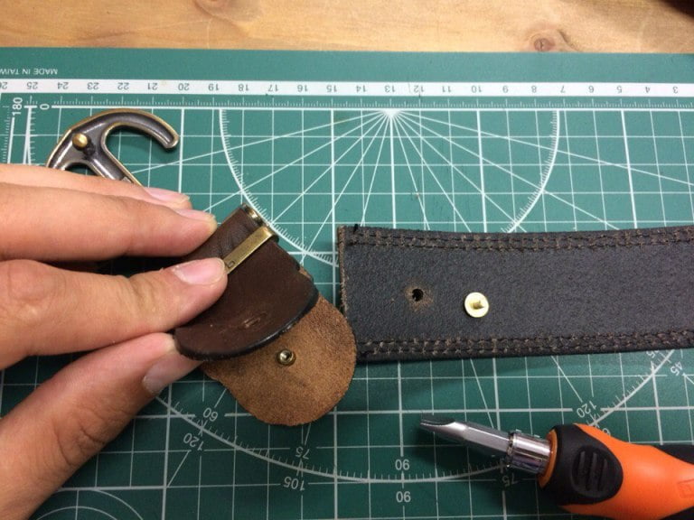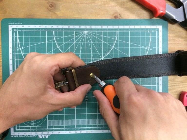 Теперь ставим на место пряжку и в новое отверстие вставляем винт и его ответную часть. Аккуратно закручиваем винт уже по часовой стрелке. Не рекомендуем его сильно затягивать, так как он и его ответная часть имеют разную жесткость – можно случайно сорвать резьбу.