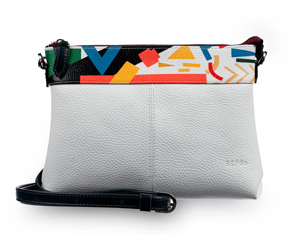На лето я подыскивала легкую и небольшую белую сумочку кросс-боди, и когда увидела Бриз Malevich на сайте Верфи, то для знакомства решила остановиться на ней. Увы- в абстрактном искусстве я не разбираюсь и к Малечичу, в частности, не испытываю особой тяги, но сочетание цветов с картины и белоснежной кожи создает настолько радостное и легкое впечатление, что… эту сумочку просто не хочется выпускать из рук!