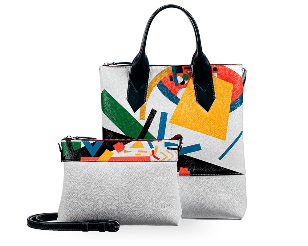 На каждом нашем аксессуаре изображено супрематическое произведение Казимира Малевича «Живописные массы в движении» 1915 года из коллекции Русского музея.