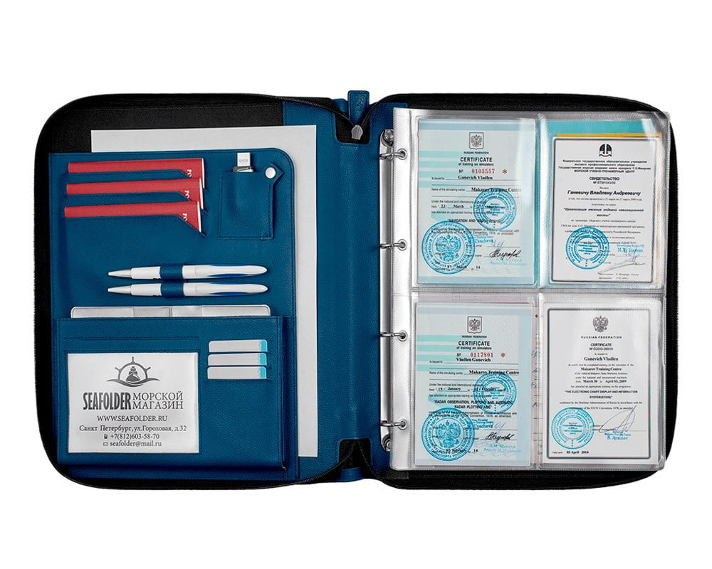 Осознание, что все документы находятся в одном надежном месте подарит спокойствие каждому моряку во время рейса. Морские папки созданы, чтобы защитить вас от путаницы в сертификатах и от суеты. Вы только посмотрите, как теперь все систематизировано! Все на своем месте. Если каждый файл и кожаный карман заполнен соответствующим документом, значит переживать не о чем: все готово для покорения морских просторов!
